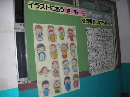 手書きのイラストと様々な表現でその感情を表す言葉が並んでいます。生徒たちは、クイズを解くように、それを見つめていました。