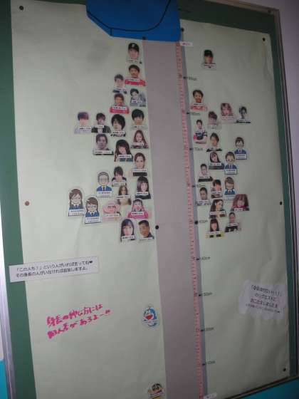 また、生徒たちは、自分の身長が伸びたかどうか、とても気になっています。そこで、メジャーを壁に貼り付け、有名人の写真をその身長の高さに貼り付けられています。生徒の中には、「有名な歌手の△さんと同じ背の高さになった」と、喜んでいる人もいます。とてもワクワクする掲示物ですね。