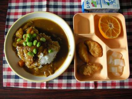 今日は、人気メニューのポークカレーライスです。枝豆を添えていただきます。おかずは、チキンナゲット、大根のピクルス、みかんです。