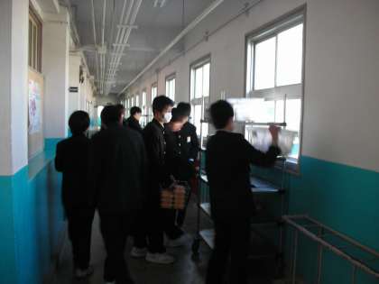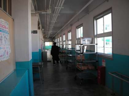4時限目の終了のチャイムが鳴ったら、すぐに給食当番の人が廊下に出てきました。給食を取りに行くためです。
