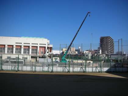 今日は、おおきなクレーン車?がやってきました。鉄骨や床板を必要な場所に吊り上げて移動しています。