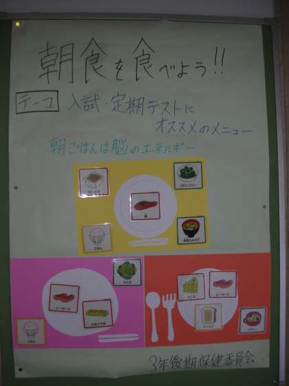 3年生は、『入試や定期テストにおすすえの朝食メニュー』で、サブテーマは「朝ごはんは、脳のエネルギー」です。