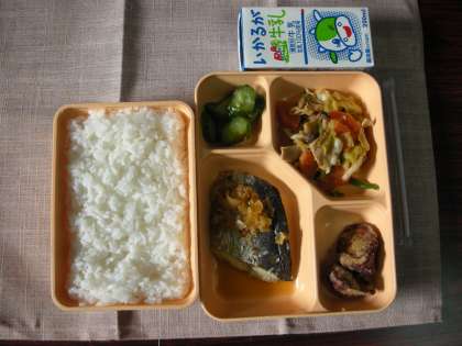 本日は、さごしの甘酢だれかけ、豚肉と野菜の中華風味噌炒め、サツマイモのから揚げ、きゅりのピリ辛あえでした。