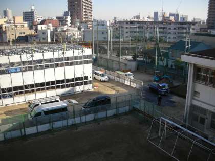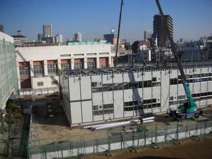 作業員さんが一番高い所に数人立っています。屋根を張る作業をしています。安全に気をつけながら、ていねいに段取り良く作業しています。