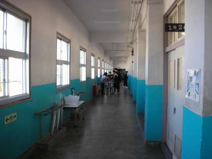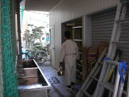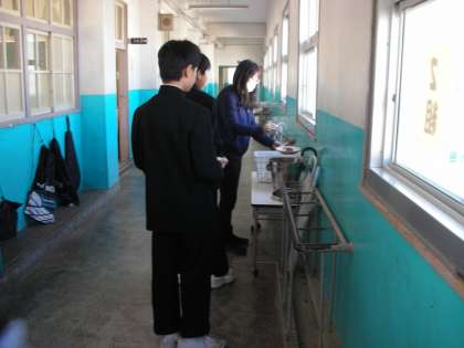 給湯室からお茶を持っていく男子。柔道の授業の後なので、柔道着を着ています。そのコントラストがおもしろいですね。