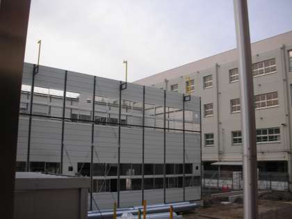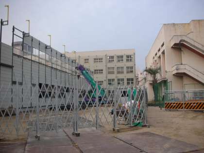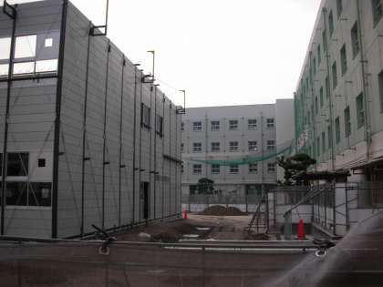 仮設校舎が建つと、どうしても学校敷地面積が狭いこともあって、多少、圧迫感が生まれます(やむをえないのですが)。このような状況ですが、都中の生徒たちは、本当に頑張っています。ありがとう!