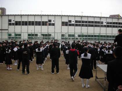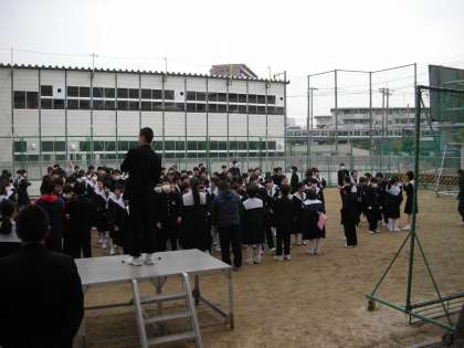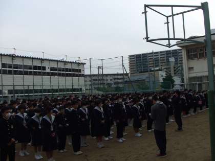 8時20分頃には、グラウンド(工事のために狭いのですが)に生徒がほぼ集まっています。生徒会長の放送指示に従って、全校生徒は行動しています。