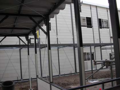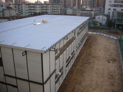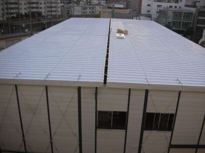 教室は、廊下を挟んで左右にあります。2階の廊下の真上に隙間があります。はしごがかかっています。この隙間から、作業する人が上り下りしています。