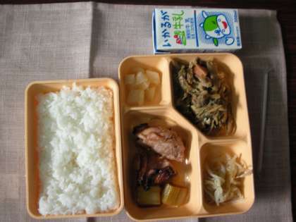 本日は、鶏肉とねぎのしょうが焼き、干しずいきの炒め煮、もやしのおひたし、かぶの煮物でした。