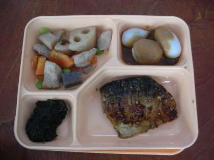 本日は、鯖のゴマ焼き、鶏肉と野菜の煮物、里芋の田楽、のりの佃煮、ふとだいこんのすまし汁でした。