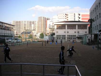 校内のグラウンドでは、硬式テニス部が練習しています。狭い場所を使っての練習ですが、頑張っています。