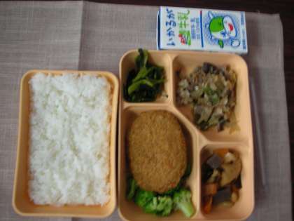 昨日は、コロッケ、ボイルブロッコリー、牛肉とピーマンのしょうゆ炒め、五目豆、小松菜のおひたしでした。コロッケの評判は良かったです。牛肉とピーマンのしょうゆ炒めもおいしくいただきました。生徒たちも「おいしいです」と、言っていました。
