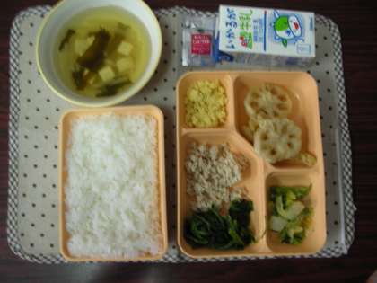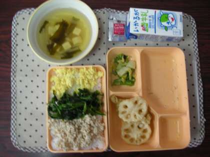本日の給食は、三色丼で、鶏そぼろ、ホウレン草、いり卵をのせていただきます。黄色、緑、薄い茶色と彩(いろどり)も良いものです。ただ、おかずの容器からご飯の容器に具材を移す時にポロポロとこぼれてしまうことが、大きな問題点です。