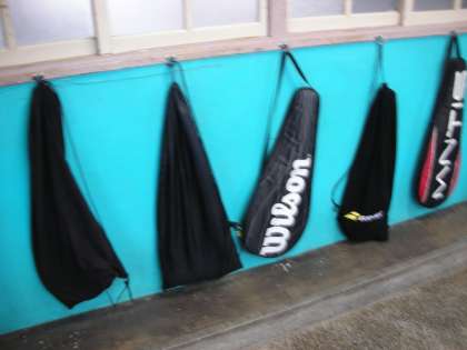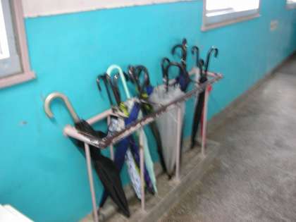 今日は、雨が降っています。教室前の廊下にはかさ立てがあります。色とりどりの傘が置かれています。