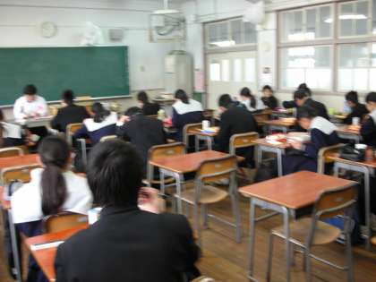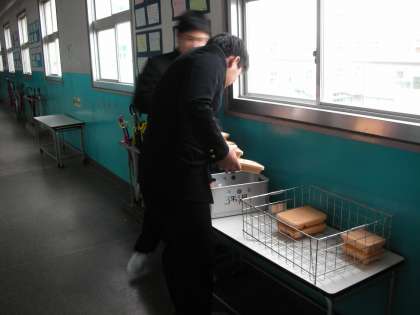 昼食時間のようすです。給食の人は、当番が運んでくれた容器を自分の分だけ受け取ります。