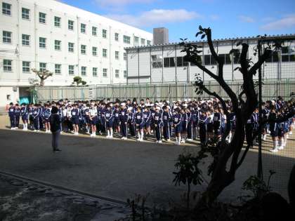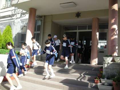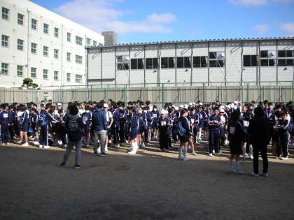 登校後に体操服に着替え、グラウンドに集合しています。