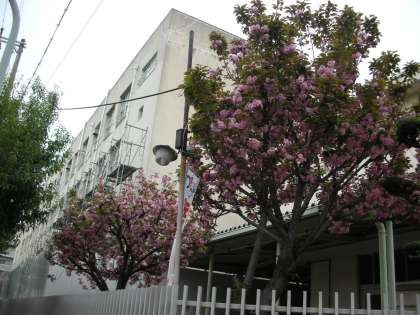 解体される南館の南側に八重桜が見事に咲いています。工事現場のすぐ近くに見事に咲き誇る桜の花は、人々の心に大きな潤いを与えてくれています。