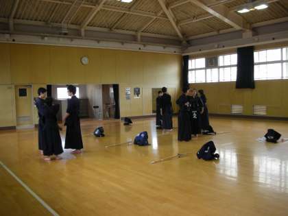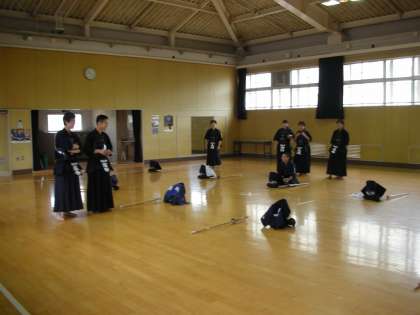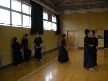 格技室では、剣道部が活動をしています。写真を撮った時は、休憩中でした。カメラに向かってポーズをとっている人もいます。練習中は、みんな頑張っています。
