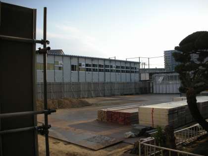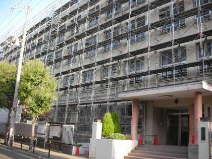 南館の壁面には、工事用の足場が高いところまで設置されました。視覚的にも工事が本格化してきたと思わせる光景ですね。