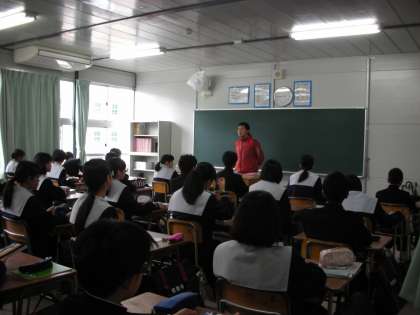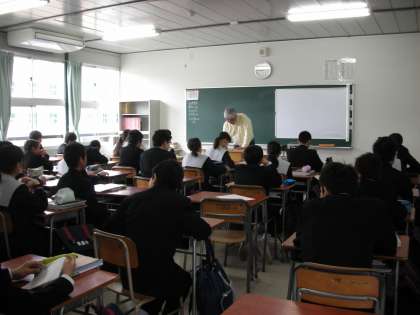 3組は、社会の授業です。先生はパソコンとプロジェクター、スクリーンを準備しています。何かの画像、映像を見せてくださるのでしょうか?