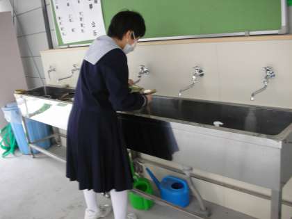 各クラスの当番の人が、管理作業員室前の棚から自分のクラスのやかんを教室まで運びます。食事が終わったら、やかんを洗って元の棚まで返却します。