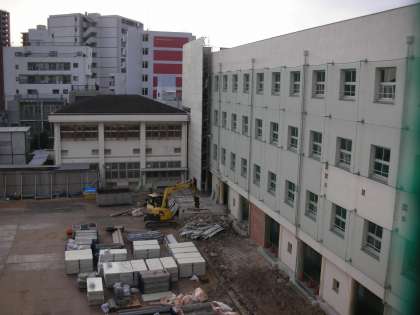 西館から南館方向を見ると、防球ネットがはずされ、給湯室が解体されました。池も取り除かれています。新たな足場を作り始めるそうです。
