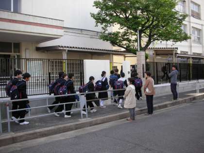 今日から体育館前の門を活用して登下校を行います。生徒たちも間違えずに、登校しています。以前よりも幅が狭い門なので、少し戸惑い気味に通っていきます。