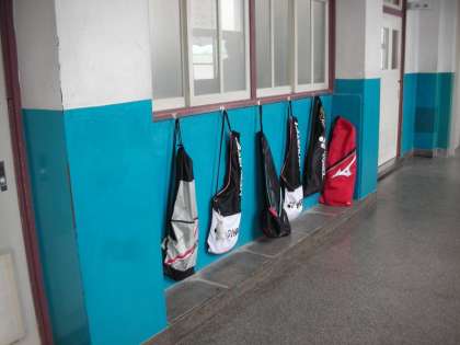 3年生の教室前の廊下には、テニスラケットが整然と並んでいます。