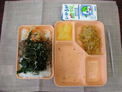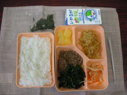 今日は、ビビンバです。ご飯の容器に、おかずの容器に入っている肉炒め、ホウレン草、ナムルをのせます。そして、のりをまぶせていただきます。このはか、ツナとキムチの炒めものとリンゴ缶詰が添えられていました。