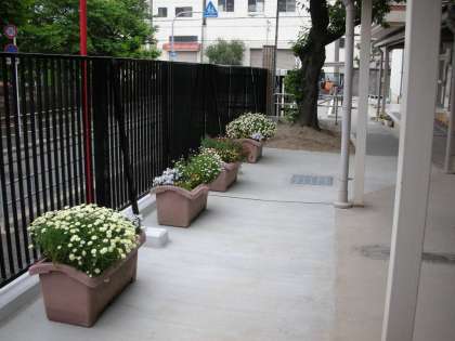 南館の正門付近に植えられていた植物を管理作業員さんがプランターに植え替えてくださいました。そのお花たちが新しくできた体育館前の正門のところで、見事に咲いています。「ホッ」としますね。