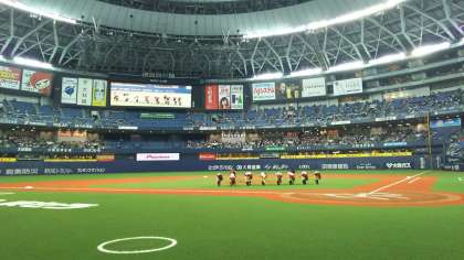 京セラドームのグラウンドに降りてきました。フィールドでは、ショーが行われています。音楽部の生徒は、出番を待っています。ショーが終わり、花束贈呈等のセレモニーが終わり、いよいよ出番です。緊張した面持ちで、ホームベースの後ろの所定の位置に並び、国歌斉唱しました。スタンドの大観衆から、大きな拍手をいただきました。