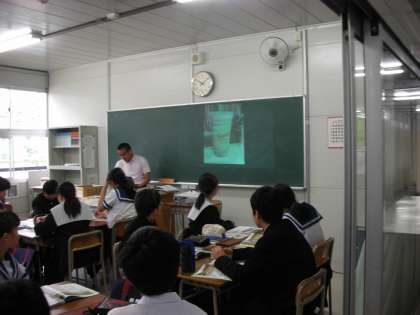 社会の授業では、パソコンとプロジェクターを活用し、資料映像をスクリーンに大きく映し出し、わかりやすく説明をしています。