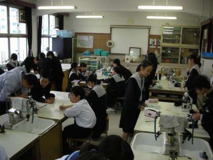 1年生の理科の授業は、顕微鏡観察を行っています。顕微鏡の使い方を学び、実際に顕微鏡を使って、ツリガネムシやアオミドロ等を観察していました。
