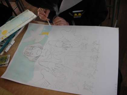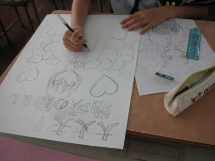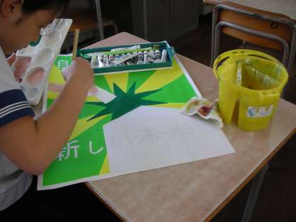 鉛筆で図案を考えている人、絵の具を使って色を付けている人と様々です。