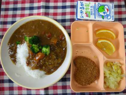 今日は、みんなが喜ぶミンチカツカレーライスです。ブロッコリーを添えていただきます。チキンカツとキャベツのドレッシングあえ、オレンジがついています。