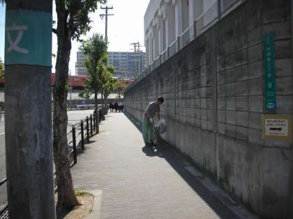 毎朝、管理作業員さんが学校周辺の路上を清掃してくださっています。「生徒の皆さんが通学するために歩く道をきれいにしたい」という気持ちを持って、そして、生徒たちの安全を見守りながらの清掃活動です。ありがとうございます。