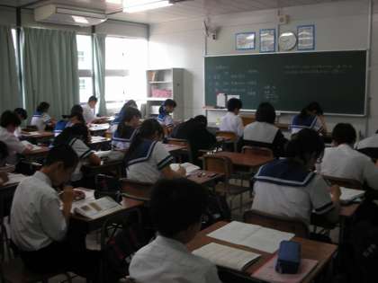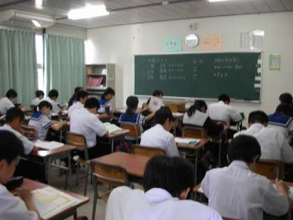 1時限目は、自習時間(テスト勉強の時間)です。みんな一生懸命教科書やノートを見直しています。