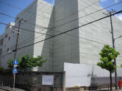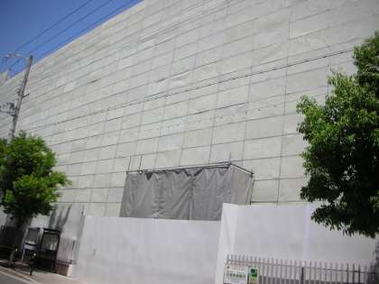 南館の外観を写真撮影しました。1枚目は、技術室側から撮ったものです。2枚目は、旧正門付近です。3枚目は、西側から撮ったものです。全面が防護壁に覆われています。写真のように、巨大な白い壁がそそり立っているように見えます。この壁の中で、工事関係者は、作業されているのですね。