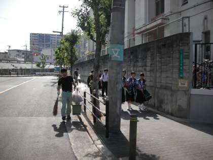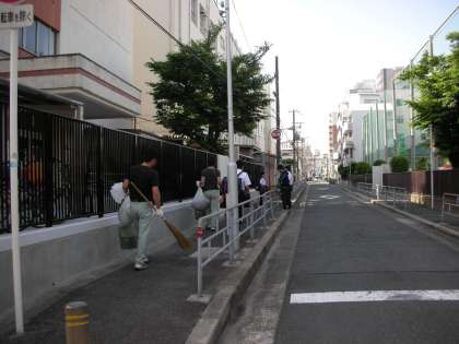 毎朝、生徒の登校時間よりも少し早い時間から、2人の管理作業員さんが学校周辺の清掃活動を行っています。生徒の皆さんの通学路を「少しでもきれいにしたい」という思いを持って、一生懸命行ってくださいます。校内でも今日は、藤棚の下の草刈りをしてくださいます。生徒の皆さんが、テストを受けているときに作業してくださいます。そして放課後は、生徒の皆さんが一生懸命清掃活動を行っています。 これらのおかげで、学校内外が美しく保たれているのですね。