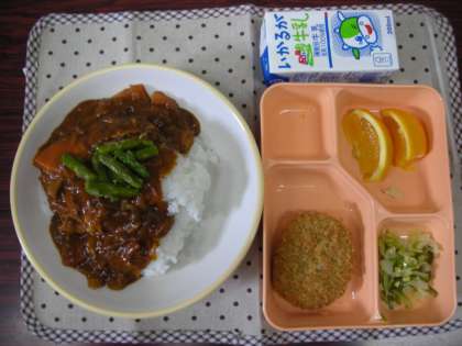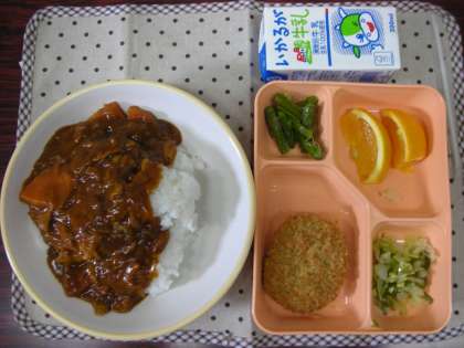 本日の給食は、人気メニューの一つ『ポークハヤシライス』です。おかずの容器に入っているグリーンアスパラガスを添えていただきます。