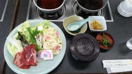 桜亭で、昼食です。写真のように、うどんすきの一人鍋です。お出汁は関東風の濃い色をしています。お腹がすいているので、ご飯のおかわりをしている男子がいました。