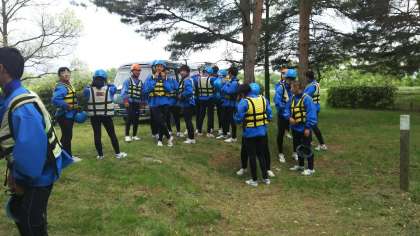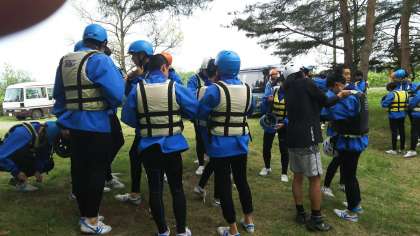 ラフティングの施設に到着しました。ラフティングをする装備を身につけ、集合しています。