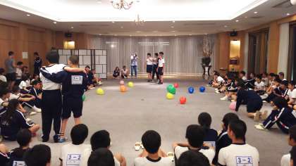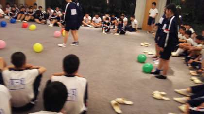 曲が流され、曲名がわかったグループは、二人三脚で風船を割り、フラフープの中に入り曲名を答えるというものです。