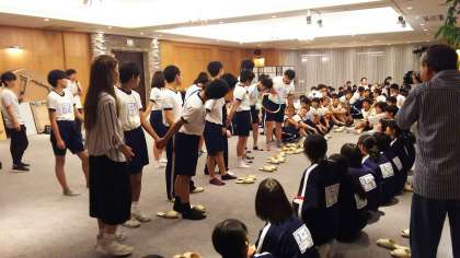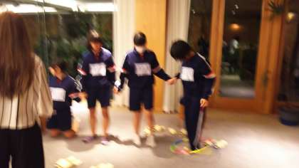 最後は、クラス対抗のフラフープリレーです。手をつないだままで、フラフープを最後の人までつないでいくというゲームです。1組が優勝しました。