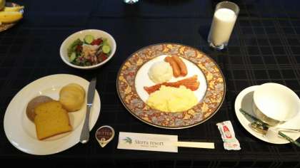 朝食の写真です。様々な種類のパン、野菜サラダ、スクランブルエッグ、ベーコン、ポテトサラダ、ウインナーソーセージ、牛乳、そしてバナナです。
