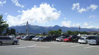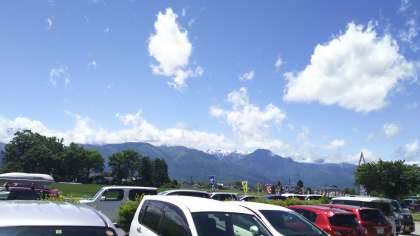 安曇野スイス村から見た南アルプスの山々がよく見えるようになってきました。先程まで体験した白馬周辺は、気温が10度ありませんでした。とても寒く感じました。この食事会場では、まぶしい日差しのおかげで、ぽかぽかした心地よい気温です。