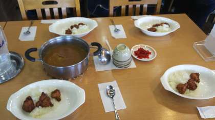 本日のお昼ご飯は、カレーライスです。鳥の唐揚げが添えられています。カレーのルーは、四人に一つのお鍋です。