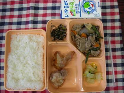 本日は、鶏肉のさんしょう風味焼き、豚肉と野菜の煮物、はくさいのおひたし、しそじゃこ炒めでした。