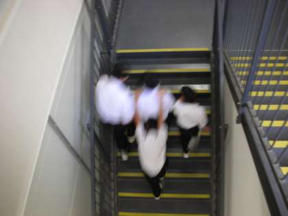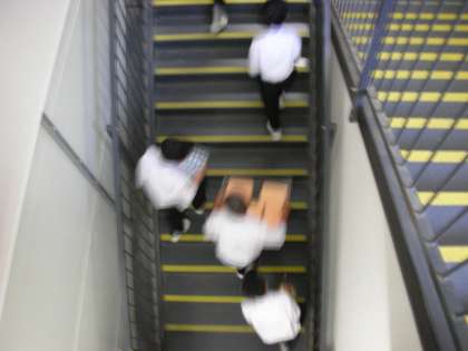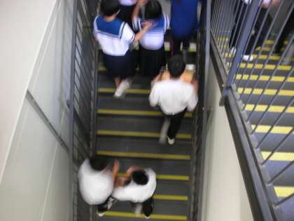 1年生の給食当番の人が、仮設校舎1階の配膳室から2階の教室に食器等を運びます。かなりスムーズになってきました。係の人が各自の役割をきっちりと果たすことは、とても大切なことですね。