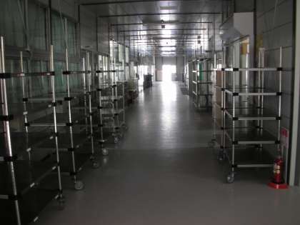 仮設校舎1階の配膳室付近の様子です。給食の食器類は教室に運ばれた後なので、ワゴンは空っぽです。ご覧のように廊下の幅は広いです。